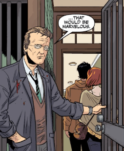 Buffy yells for Dawn to hurry. She wants to get this lunch over with. Giles opens his mouth, readying advice, but Buffy asks him not to. “Look, we love you. But we don’t need a Watcher anymore. We know how to fight demons and stake vampires. If we need anything right now it’s help with real life. Someone to tell us how to be normal healthy adults. And I’m not trying to be a jerk, but I don’t think that’s you.”