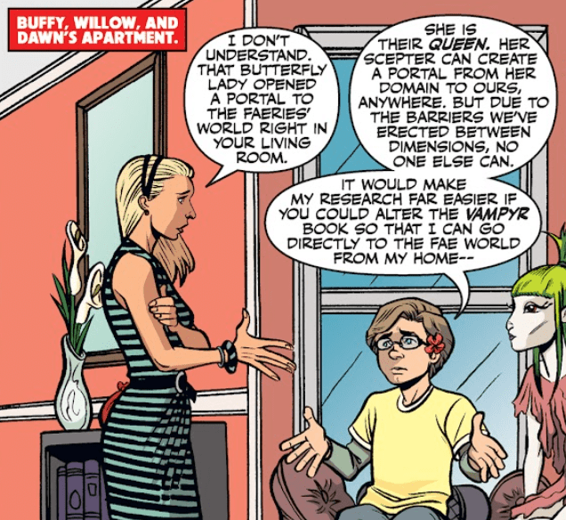 A tense conversation is unfolding in the apartment of Buffy Summers. Giles wants to write in the Vampyr book – a rule creating a permanent portal between Earth and the realm of the Fae Folk — a realm he’s clearly grown fond of. Buffy doesn’t like it.