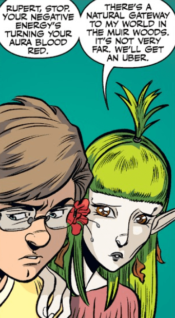 His outburst takes Buffy by surprise. His Fae companion — whom he calls Sundrop — tells him his aura is not pleasant when he’s angry. It’s gone a bit red. He apologises to her, but not to Buffy. The youngsters make a swift exit, slamming the door in Buffy’s face.