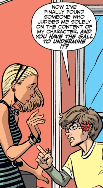 “How dare you. I have put up with your ridiculous and, quite frankly, interminable romantic misadventures for years! Now I’ve finally found someone who judges me solely on the content of my character, and you have the gall to undermine it?”