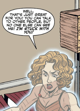 “Well, that’s great for you!” she yells. “You can talk to other people, but no one else can see me! I’m stuck with you!”