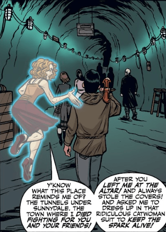 As the group enter the park, they travel through a tunnel lit by lanterns in the ceiling. Anya, hovering alongside Xander, says it reminds her of where she died beneath Sunnydale. She finds time to complain too.
