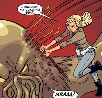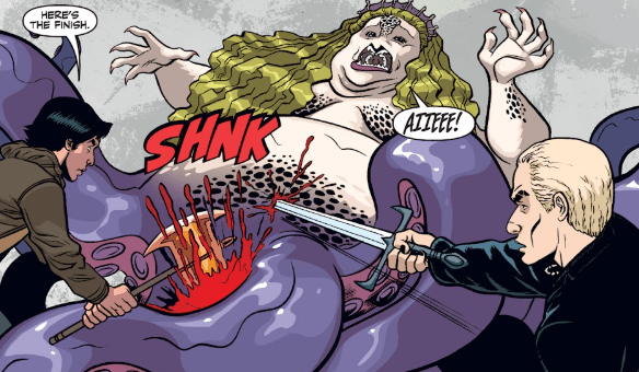 Needing a lift, Giles magically sends Buffy up towards the Soul Glutton’s head. She uses the Scythe as a climbing pick, and the Soul Glutton roars as the blade drives into the side of his skull.