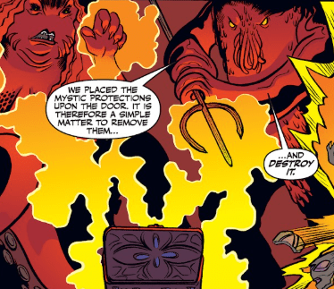 In the midst of battle, Andrew notices something else. A portal has been opened to the Hell of Screams — and an invading demon army is minutes away from entering their dimension. As Dawn and Andrew try to destroy the force field protecting the Restless Door, Andrew reminds them that only one portal can be maintained by the artefact at any one time — which means D’Hoffryn is on his way to back them.