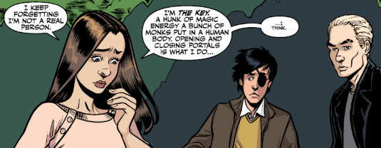 Dawn looks down at herself as she speaks. She’s the Key — a hunk of magic energy that a bunch of monks placed in a human body. Opening and closing portals is what she’s supposed to do.