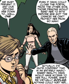“Even if Dawn could close the portal from the other side,” Spike rages, “those demons would rend her to bits before she got the chance. We can’t protect her from so many.”