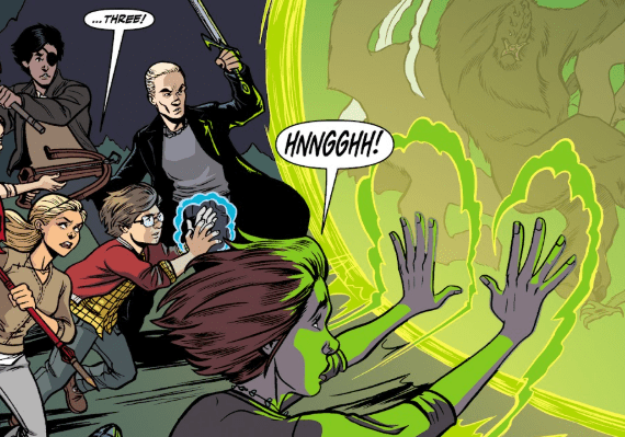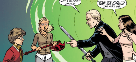 That’s enough for Buffy, who swings at the approaching horde and orders her friends back through the portal.