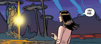 Kerberon screams in pain. Dawn, effortlessly — light as a feather — rises into the sky, floating, held aloft by energies so bright Buffy doesn’t have words. The energy extends from Dawn like a turret, surrounding the God-King and surging through him.