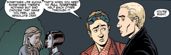 Spike starts to get angry. Buffy looks to the floor. Dawn stops Spike before he says something he’ll regret.