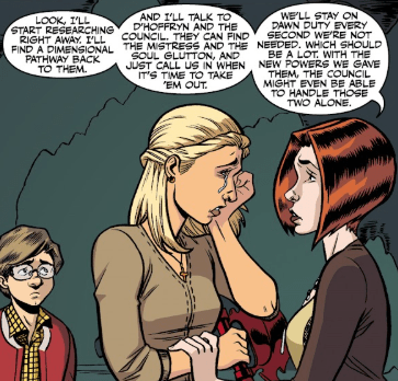 Willow tells Buffy they’ll start researching right away. She’ll stay on Dawn duty while D’Hoffryn deals with the bad guys.