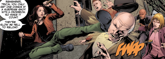 He turns, irritated more than hurt. Civilians Tricia and Parker are behind him, armed with a crossbow. Tricia is struggling to reload. As the vampires charge towards the young couple, however, Faith arrives from the shadows of the nearest alleyway, landing her foot straight across the leader’s face, knocking his very fine hat off his head in the process.