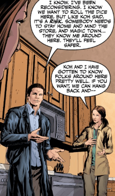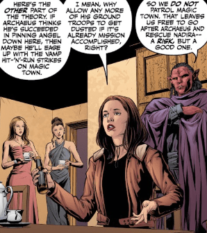 Faith joins him. “If Archaeus thinks he’s succeeded in pinning Angel down here, then maybe he’ll ease up with the vamp ‘hit and run’ strikes on Magic Town.” Koh takes it all in and, from behind Faith, speaks, grimly. “So we do not patrol Magic Town. That leaves us free to go after Archaeus and rescue Nadira – a risk, but a good one.”