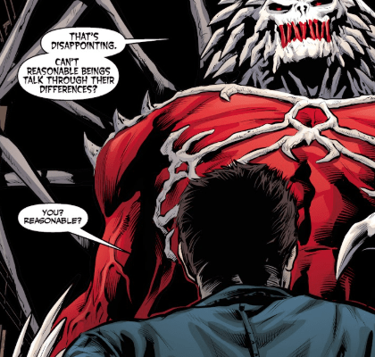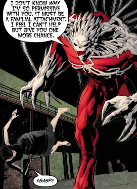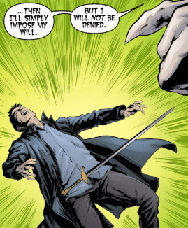 Archaeus almost laughs at him. “IF I WANTED YOU DEAD, YOU’D BE DEAD. IF YOU WON’T JOIN ME WILLINGLY, THEN I’LL SIMPLY IMPOSE MY WILL.” He points a clawed finger at Angel and smiles. “I WILL NOT BE DENIED.“