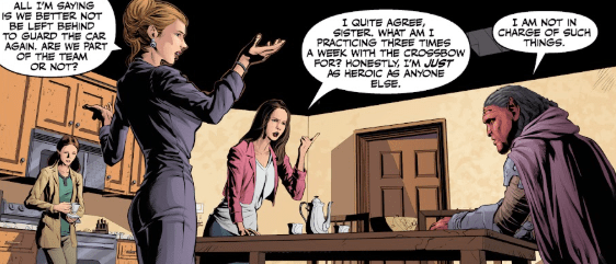 In the kitchen, battle plans are forming. Sophie wants to make sure that she and her sister get something to do this time: she’s sick of guarding the car. Lavinia concurs. She has put in the practice with the crossbows – she would like a chance to use her skills. “I’m just as heroic as everyone else!” she complains around the circular dining table.