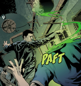 Angel is suddenly thrown back hard against the nearest concrete wall, his back making an abnormal sound. Green energies flow around Archaeus as he grins. Drusilla moves to Angel’s side.