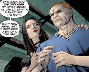 The vampire stands there, rubbing his hands together in anticipation of the fight. Drusilla is suddenly behind him, glaring at Angel from the shadows. She calls her foot soldier off, much to his disappointment. He tells Angel that he’ll keep, and walks away, leaving Angel and Drusilla alone together.
