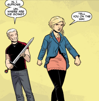 Buffy closes her eyes and waves her arms at him. “I don’t have the bandwidth to deal with this right now. All this time we’ve spent beating up demons, only to have them tell us D’Hoffryn can’t be stopped, gave me an idea.” She hands Spike a sword and tells him that they need to hit the road. And she needs him with her.