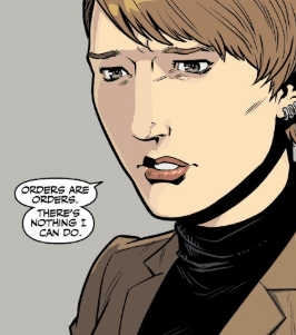 He tells her, for the second time, that she cannot be trusted and that she is to leave the base immediately. He doesn’t give her a chance to argue, and the man, an admiral by the look of his jacket, storms out of the room.