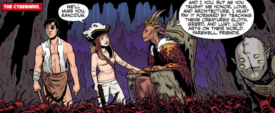 In the Cyberhive, Rancidus leaves them behind to lead a colony of centipedes in how to be selfish and greedy.