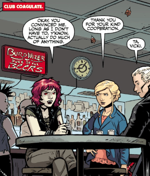 On Earth, in a vampire dive bar, Spike and Buffy sit with Vicki. The vampire is impatient, but listens to what Buffy has to say. She agrees, as long as she doesn’t have to do anything much. Buffy smiles sarcastically and thanks her for her cooperation.