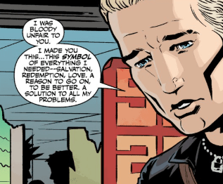 He looks at her for a moment, in silence. Then, with a sigh, he speaks quietly. “I was bloody unfair to you. I made you this symbol of everything I needed — salvation, redemption, love… A reason to go on, to be better. A solution to all my problems. And selfish as it was, I needed that at the time. I don’t anymore.”