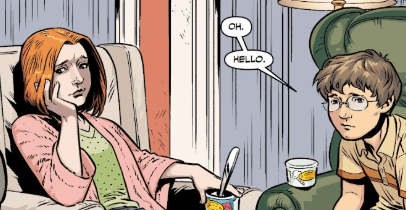 They walk into their apartment building arm in arm. Buffy says they’re going to have to cover more ground — but they’ll need help. Opening her apartment door, she’s surprised to find a despondent Willow and Giles sitting on the sofa.