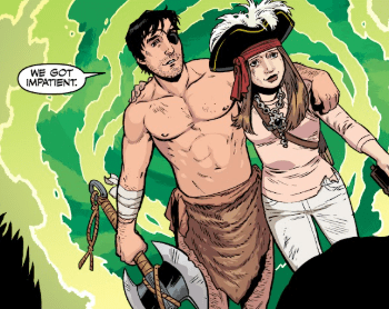 In a dimension known to its inhabitants as Slaughterworld, Dawn, complete with pirate hat, has acquired the legendary Amulet of Revelation which will show her where the exact portal is. They are no longer stabbing in the dark.