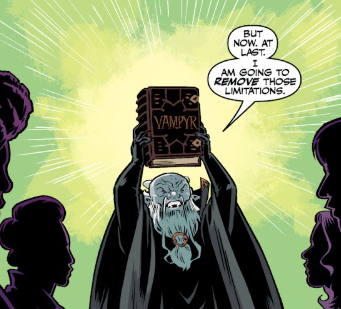 He holds up the Vampyr book in his hands. With it, he declares, he plans to remove those limitations.