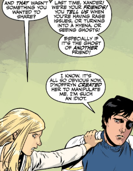 Buffy gets in his face. “And that wasn’t something you wanted to share? Last time, Xander! We’re your friends!” she yells angrily. “You tell us when you’re having rage issues, or turning into a hyena, or seeing ghosts! Especially if it’s the ghost of another friend!”