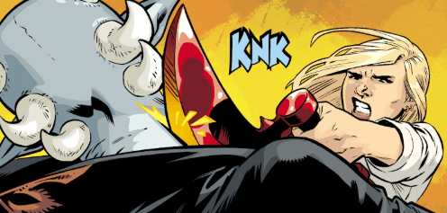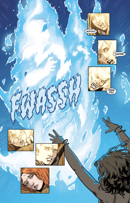 All weapons, lasers, scientific ray guns and magical blasts and bursts all hit D’Hoffryn at once. Before he can recover, Buffy swings her Scythe. She runs between lasers, flipping through the beams of light as they strike at the demon and his vengeance minions scatter.