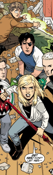 He turns to his people. They all look human, but they all have vengeance amulets around their necks. Two of their number are familiar: former Sunnydale High student Jonathan Levinson and Scooby Gang member Anyanka.