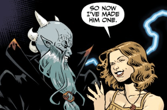 Jonathan has questions. He thought they were already pretty powerful. D’Hoffryn agrees but power, he says, is like chocolate – the more you have the more you crave. He’s managed to strip away the magical protections on the book and now plans to write the elimination of any restriction that can stop him, instantaneously becoming magical law.