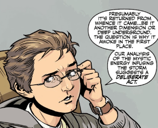 Giles closes his book and leans back. “Presumably it’s returned from whence it came… another dimension or deep underground. The question is why it awoke in the first place. Our analysis of the mystic energy infusing the storm suggests a deliberate act.”