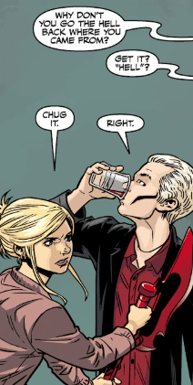 Spike savours his few drops of nourishment, but Buffy hears something nearby and tells him to “Chug it.” He downs the last of it and follows as she turns a corner to find a mob forming around a demon. He has horns and hooves, but that does not necessarily mean he is a threat. Either way, the mob are insisting, in no uncertain terms, that he “should go back where he came from.” Some hold blunt instruments — Buffy can see this will not be settled quietly.