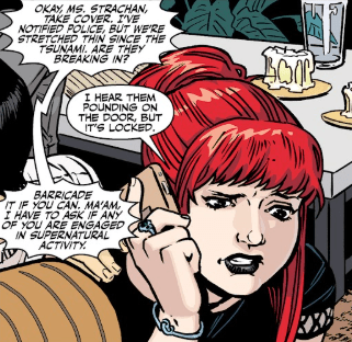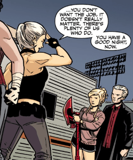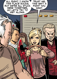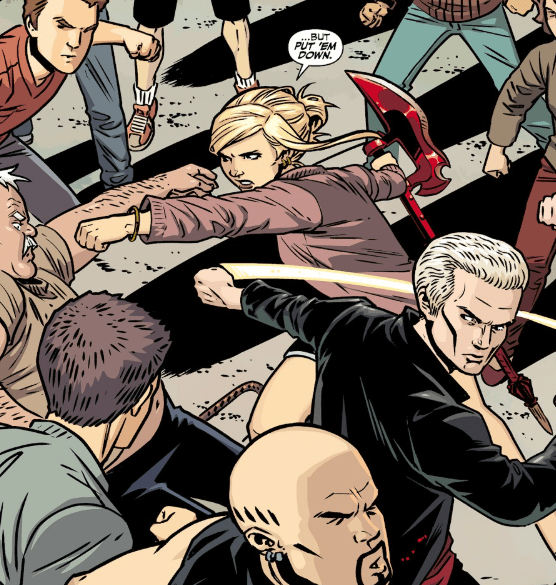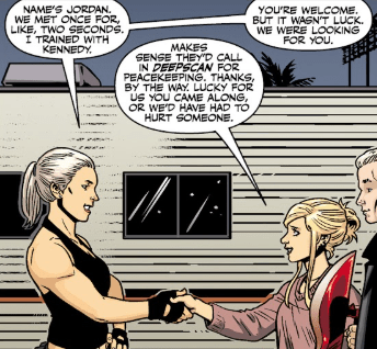The mob begrudgingly obey. Buffy and Spike pick themselves up. The woman introduces herself as Jordan, shaking Buffy’s hand. They have met before: Jordan worked with Kennedy for a time. Buffy smiles. She had figured DeepScan would enter the peacekeeping realm. She thanks the new Slayer again. Buffy really did not want to hurt anyone.