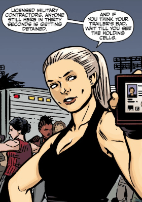“Licensed Military Contractors. Anyone still here in thirty seconds is getting detained. And if you think your trailers are bad, wait till you see the holding cells.” She is confident, a slight smile on her face.