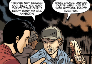 Outside, one man stops another from lighting another bottle, only to be told this is what you do with witches. “You burn them,” he leers, his face twisted in the flame’s glow.