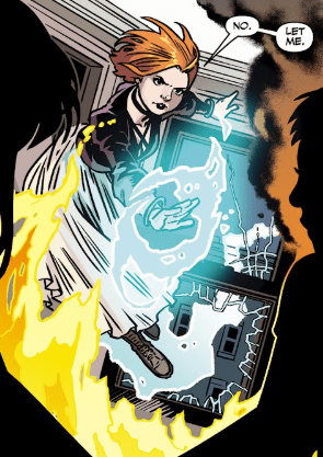 Inside, Linda physically grabs Calliope, urging her to crawl. But then, through another window, hovering untouched by the flames, comes Willow Rosenberg.