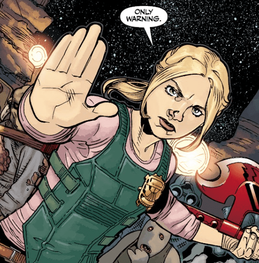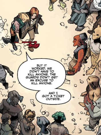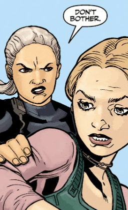 “But it worked,” Buffy whispers. “We didn’t have to kill anyone. The guards didn’t get an excuse to kill anyone. And I got a ticket outside. Where I can start finding a way out that’ll work.” She grins through the pain.