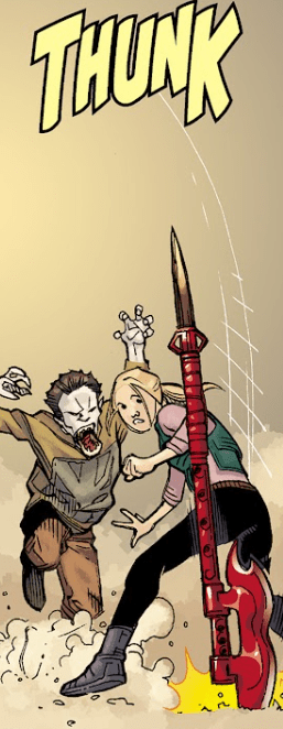 “Your funeral,” Buffy says, kicking his legs out from under him and bringing him straight down onto the pointy end of the Scythe, protruding from the ground. The vamp is dust in moments.