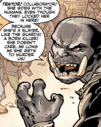 “Collaborator. She sides with the humans, even though they locked her in here. Because she’s a Slayer, like the guards. A born killer. She doesn’t care, as long as she gets to murder us.”