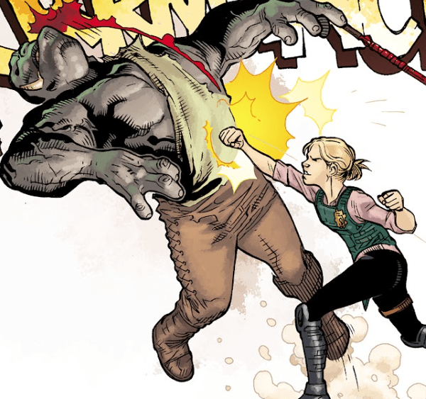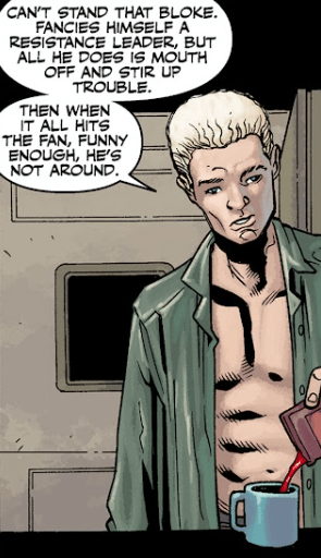 Buffy sighs again. She’s not trusted as a Trustee because, unlike the others who only do it for extra rations, she actually keeps the peace in the Safe Zone. She’s only doing it to secure blood for Spike. And to move through the camp — fight a way out.