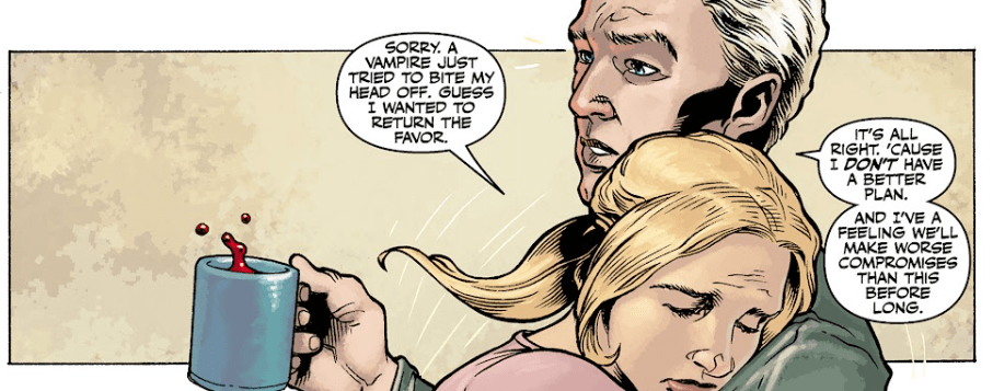 “Well, if you’ve got a better plan, let’s hear it!” Buffy snaps, louder than she intended. She instantly looks guilty and pulls him into a hug. “Sorry. A vampire tried to bite my head off. Guess I wanted to return the favour.”