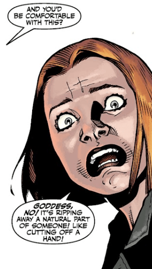 Remembering her past, Willow turns and shrieks in horror. “Goddess, no! It’s ripping away a natural part of someone. Like cutting off a hand!” She stops, looking down at the ground. “But if they stay here, they could lose a lot more.”