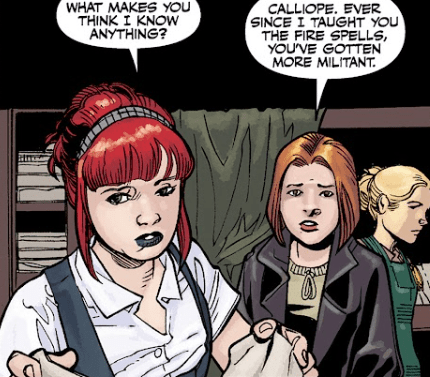 Some time later, Willow discusses the idea with Buffy. She has her reasons, but she hasn’t told the other Coven members yet. When Buffy asks why, Willow stops — because Calliope is sitting on her trailer step, grinning as a bright light shines in her palm.
