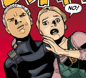 He hesitates — then, with surprising speed, grabs Buffy by the throat with one hand and snatches her Scythe with the other. Lifting her off the ground, he snarls, “That’s it. You’re done, you traitorous—”