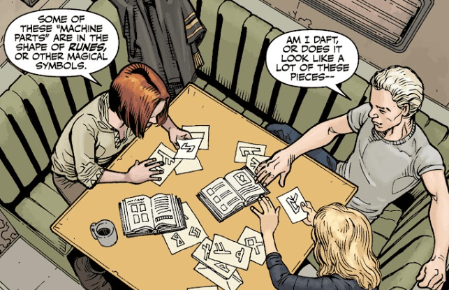 Later that evening, in Buffy and Spike’s trailer, Buffy, Willow and Spike gather around a table. Her notes from the day’s facility tours are scattered everywhere. Willow notices that some of the machine parts resemble runes or magical symbols.
