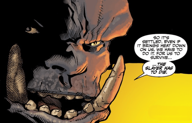 “So, it’s settled,” he bellows. “Even if it brings heat down on us, we have to do it. For us to survive, the Slayer has to die.”