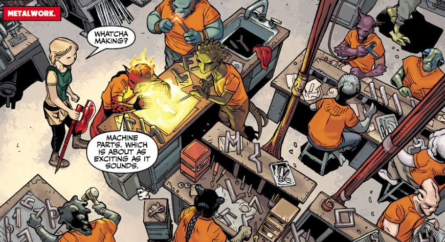 As Buffy leaves the Safe Zone, she spends the day observing operations in the nearby factories. One is a metal shop where residents make metal parts — that’s all they know.