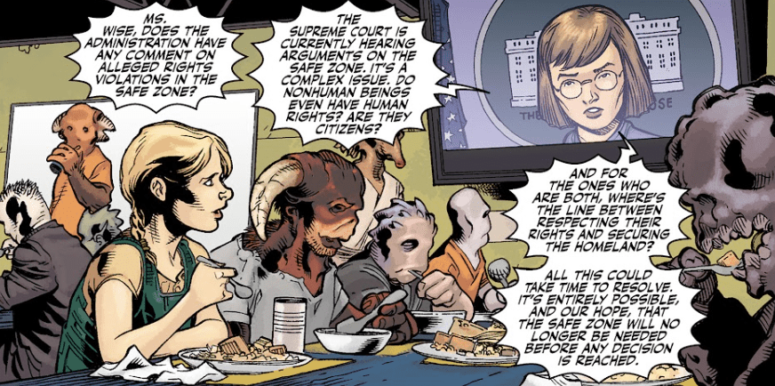 She sits in the staff canteen with the other demon Trustees. On the news, Ms Wise, the President’s press secretary, takes questions. She suggests the Safe Zones will last longer.